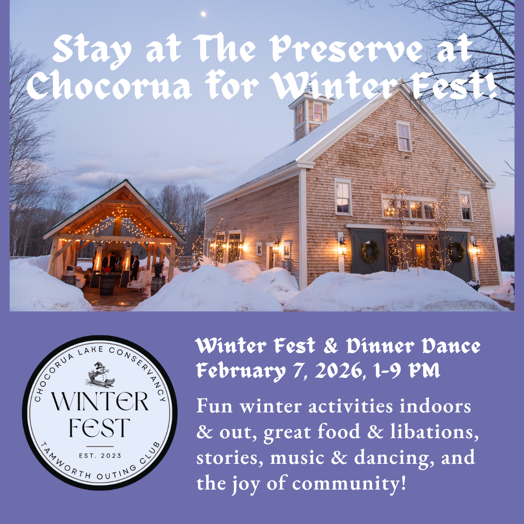 If you are coming from out of town and would like to book a room at The Preserve and make a weekend of it, please contact Anna Paddock at apaddock@chocorualake.org or (603) 323-6252. Room rental proceeds also benefit the work of CLC & TOC, and all room bookings come with free tickets to the Winter Fest Dinner Dance.