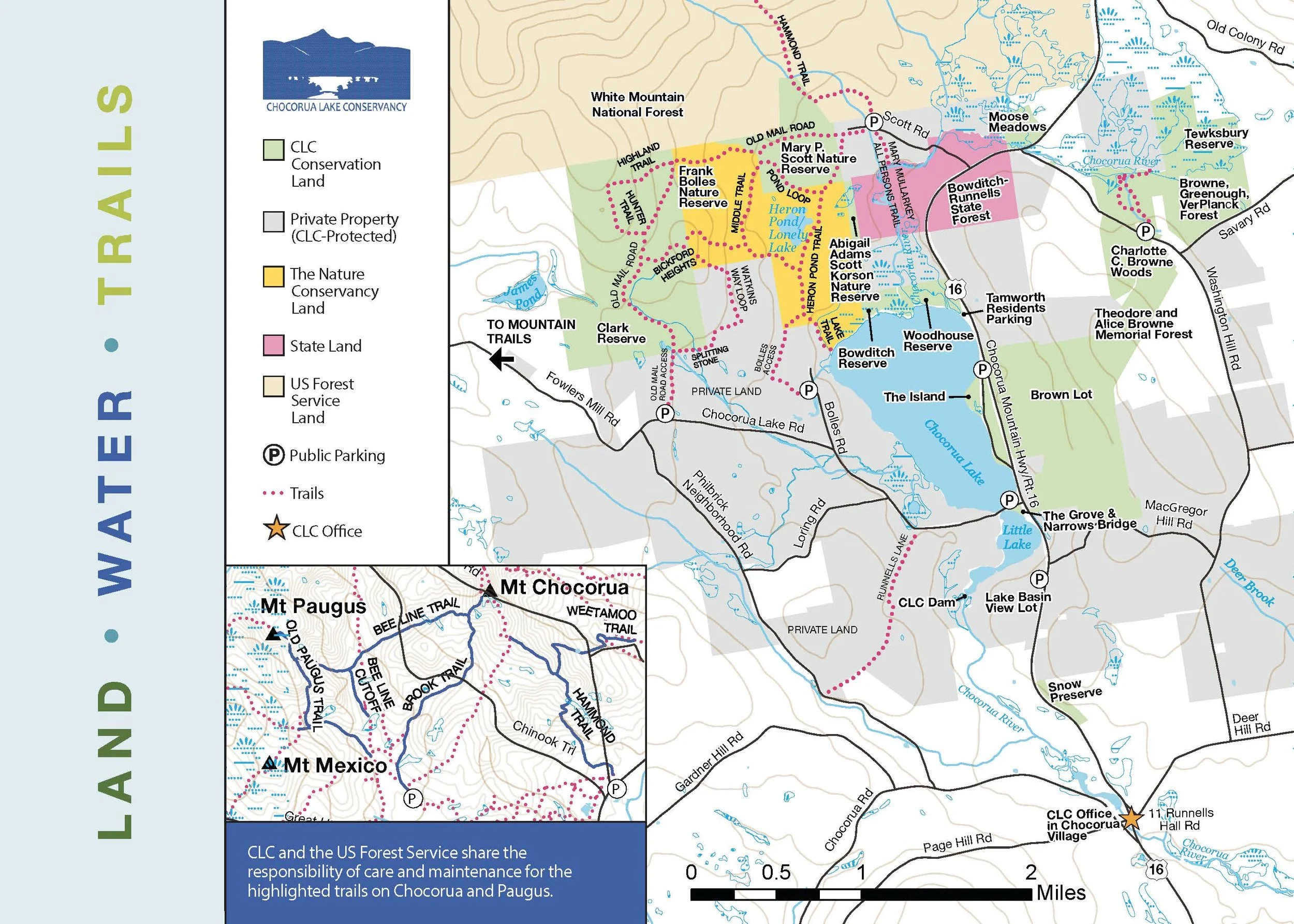 Chocorua Lake Conservancy achieves the long-term protection of the Chocorua Lake Basin by seeking, holding, and monitoring conservation easements and by accepting land ownership. We want to ensure that the Chocorua Lake Basin’s unique balance between the natural state and mankind is preserved forever. CLC owns or manages 800 acres of conservation land across 17 properties in the Chocorua Lake Basin, and protects 2,500 additional acres through perpetual conservation easements and covenants on over 100 other properties.